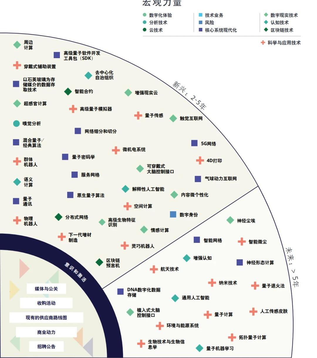 報告開篇,德勤更新了去年報告中提到的九大宏觀力量。這些力量——包括數字化體驗、分析技術、云技術、核心系統現代化、風險、技術業務、數字現實、認知技術和區塊鏈——構成了未來企業的技術基礎。與此同時,今年的報告中還新增了三項基石技術,即環境體驗、指數型智能和量子技術,也將成為宏觀力量的重要構成之一。