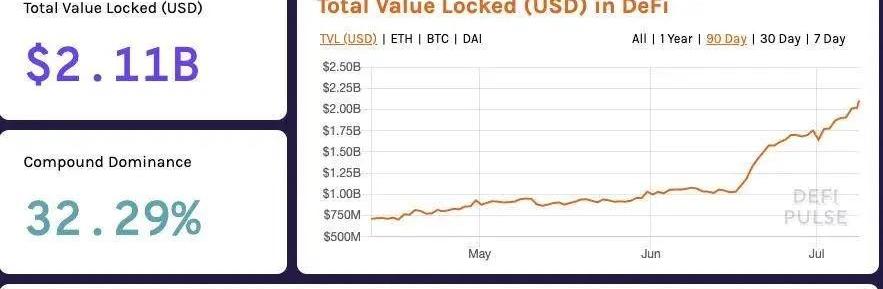 不僅僅是DeFi總市值,DeFi總鎖倉也屢創新高。根據defipulse的最新數據顯示,以太坊去中心化金融項目的總鎖倉值今日已突破了20億美元,創歷史以來的新高。今年2月7號,defipulse博客特意發了篇文章慶祝道:去中心化金融達到了一個新的里程碑,總鎖倉超過了10億美元。它說明了我們正在逐步實現社區對去中心化金融的愿景。短短幾個月的時間,以太坊DeFi生態的DeFi總市值,DeFi總鎖倉屢創新高,究竟發生了一些什么?這里就不得不談一談6月剛發行的明星項目Compund。