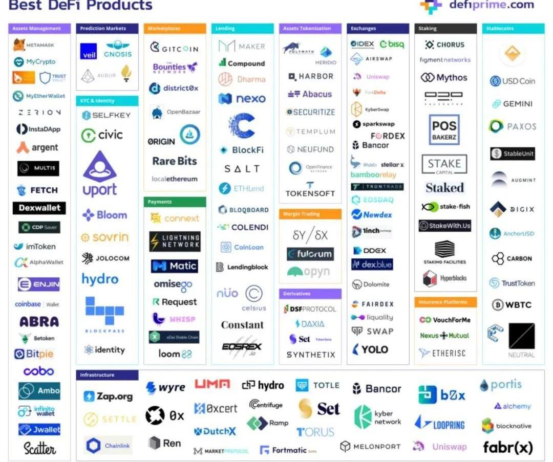 圖:DeFi的用戶增長情況,來源:DuneAnalyticsDeFi誕生于可編程的以太坊區塊鏈出現之后,從分布上看,目前大部分DeFi項目集中在以太坊區塊鏈上,其次才是EOS、TRON等公鏈。從產品形態上看,目前的DeFi已經含括了去中心化錢包、KYC和身份認證、去中心化交易平臺、去中心化借代、Staking、穩定幣以及其他基礎設施,整個生態在不斷完善。