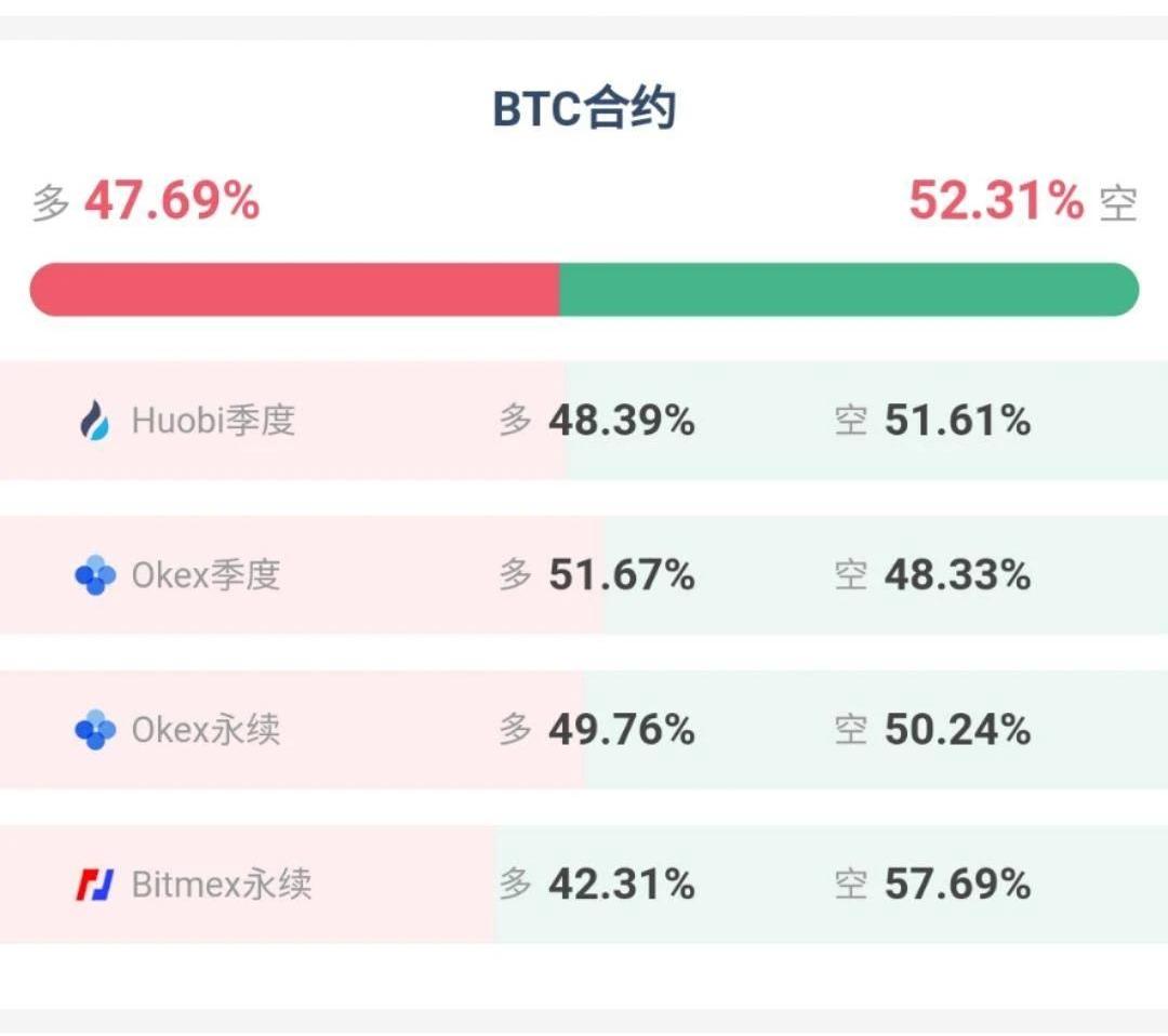 過去一年比特幣的最高價格是13968美元,那么是否可以理解說,在這些未動過地址的比特幣掌控者眼里,未來的價格目標不止14000美元,但是持幣周期也會相應的變長。最近我們經常可以看到頻繁的有比特幣從交易所轉移到個人地址上,這實際上也是在走囤幣投資風格,所以最近盤面振幅越來越小,或許就和囤幣的投資者越來越多有關。再回到和金融市場的聯系上,某些時候出現巧合性的聯動式往往會被拿來煞有介事的炒作,這種聯動性往往就被掩蓋了真相,最真實的就是當前的情況,投資環境變好怎么了,投資者情緒變樂觀怎么了,該不理幣圈的還是不理幣圈,所以我們還是要認識一些客觀的事實,幣圈大部分時候還是一個跟其他市場沒有什么交集的圈。當然這樣說還是太極端了,關系還是存在的,我們可以這樣理解,當金融市場變差時,其他市場爭相跳水時,此時看莊家有沒有收割的要求,若是有的話,所謂的“聯動性”就出來了,若是沒有的話,那比特幣跌少一點甚至不跌反漲,事后還要美名其曰,比特幣厲害啊,在悲觀情況下成了最抗風險的資產。而在市場環境轉好的時候,如當下,幣圈或許是投資者心中比較靠后的選擇,因為這時候介入迎接而來的可能就是一波韭菜收割,有時候市場被高度控制或者氛圍不理想時大家都是能切實感受到的,其他的金融市場開始有動作時幣圈還是一點反應都沒有?只能說參與的人實在是太少了。當然,現在一天時間還沒過去,若是晚些時候莊家開始有所動作也是有一定概率的,畢竟其他金融市場都有投資者盯著,如此表現的話自然有人會拿比特幣市場來對比,這個時候適當表現一下反而會更吸引投資者介入,關注晚些時候盤面的動向吧。回到行情上,幣coin上的數據顯示當前整體是空頭合約持倉占優,整體也符合當前空頭趨勢,但是越是這樣的表現就要越小心插針。