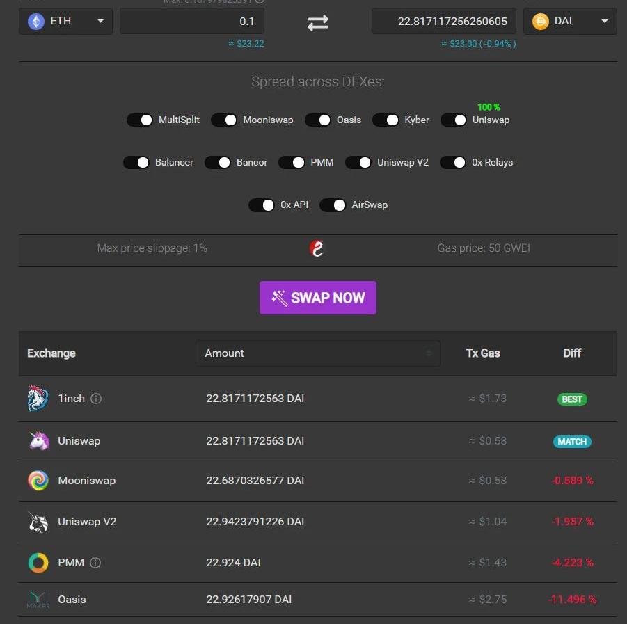 以1inch為代表,交易0.1ETH尋找最佳價格的同時,預估發起該筆交易的Gas費用,此時使用Kyber產生4$的手續費后,這筆交易的性價比是很低的。尋找各DEX中交易的最佳價格也可以通過Dexindex來查詢,以下是計劃使用DEX兌換10000DAI的最佳交易途徑。