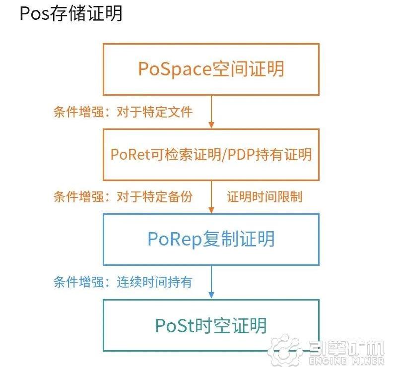 其他主要證明方式還包括:復制證明Proof-of-Replication,PoRepPoRep是PoS的進階版,可以證明礦工已將數據存儲,并保證每份數據存儲的獨立性,同時防止女巫攻擊、外源攻擊和生成攻擊。復制證明避免讓礦工可以透過不同方法讓自身存儲數據小于承諾存儲數據,以獲得額外報酬。時空證明Proof-of-Spacetime,PoSt礦工證明自己花費了Spacetime資源,即一定時間內的存儲空間的使用,PoSt是基于復制證明實現的。即使驗證者不在線,也能夠在未來去驗證礦工在該段時間內生成了證明鏈,有效防止臨時生成數據攻擊。數據持有性證明Provable-Data-Possession,PDP礦工完成了用戶存儲數據的訂單后,為了證明數據已經被自己存儲,用戶可以多次驗證礦工是否將其數據保持存儲的狀態。可檢索證明Proof-of-Retrievability,PoRet與PDP類似,證明礦工存儲的數據是可以用來查詢的。總結:在預期共識中,礦工贏得選舉的可能性跟礦工當前的存儲能力成正比,而存儲能力則由復制證明和時空證明來衡量。再用一張圖來詳解這幾個證明機制之間的關系。