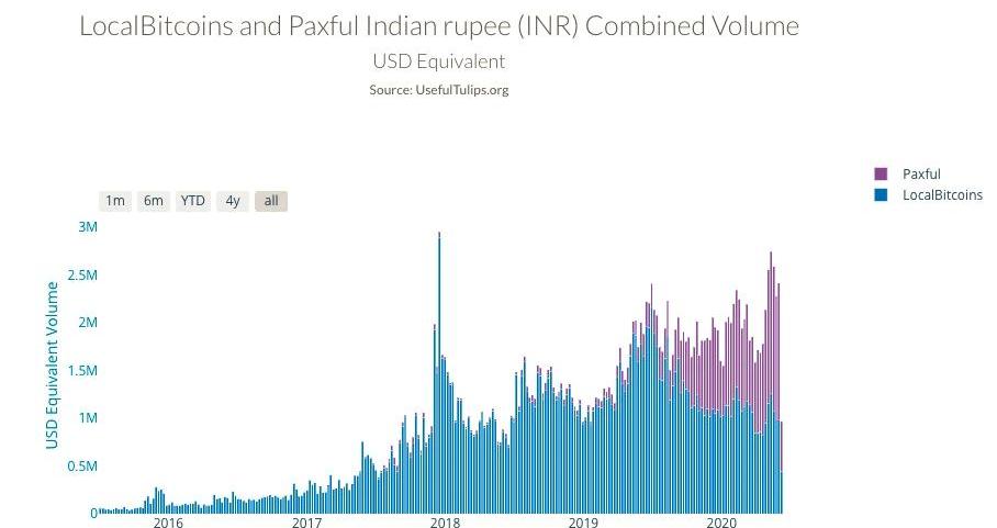 解讀:Defi生態是區塊鏈世界最大的落地應用之一,其形式包括比特幣閃電網絡、質押借貸、DEX、穩定幣發行等等,目前已受到包括Web3.Capital、CoinbaseVenture、分布式資本、MorganCreekDigital等一眾知名圈內資方的注資。目前,DeFiMarketCap收錄的666個Defi項目,發行的代幣總市值已超過24億美金,短期內市值的快速增長,體現了Defi生態的爆發力。4、數據:美國點對點比特幣周交易額近2900萬美元,創下新紀錄據Cointelegraph6月11日消息,UsefulTulips發布的數據顯示,6月7日,美國的點對點比特幣交易激增,創下了有記錄以來的最高單周交易量,Localbitcoins和Paxful上的交易額達到了近2900萬美元。其中,Paxful交易的比特幣價值超過2400萬美元,Localbitcoins交易的價值為460萬美元。解讀:此前,交易平臺Paxful的一項調查顯示,有近50%的受訪者認為,美國居民正在考慮將加密貨幣作為當前金融體系的替代品,但由于政策原因,美國投資者在正規交易買賣比特幣遭到了眾多限制,因此點對點交易所成為首選。Localbitcoins與Paxful作為全球范圍的專業的點對點加交易所,滿足了一部分投資者的交易需求,但近期Paxful的成交數據正在爆發式增加,Localbitcoins的市場份額遭到了嚴重侵蝕。