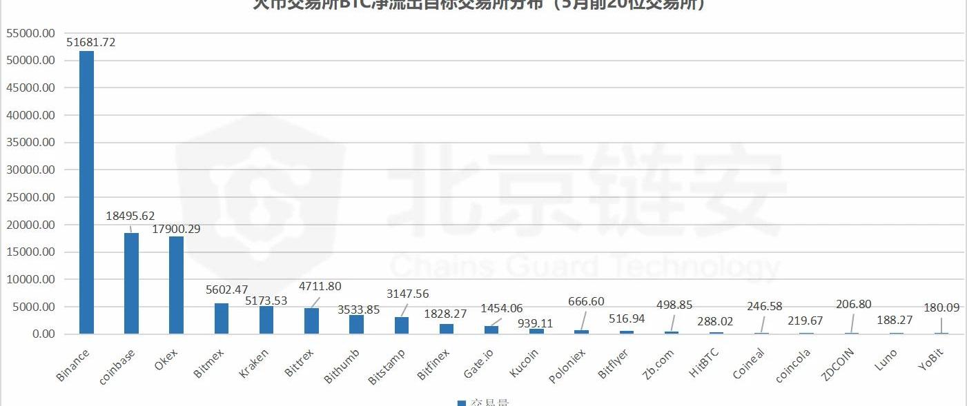 從2020年4月和5月兩個月的Okex的比特幣凈流入與價格比較來看,整體數據波動比另外兩大交易所更大。接下來,讓我們看看,在5月份,幣安、火幣、Okex交易所提出的BTC,又主要流向了哪些交易所呢?經過我們的分析,列出了可以識別的前20位交易所的數據。