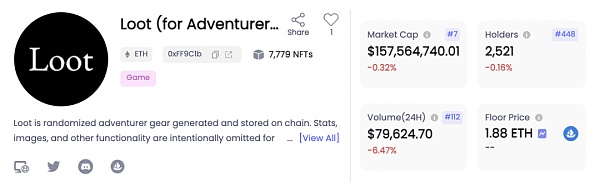 ?Loot (for Adventurers)的市值,持有者數量,24小時交易量和地板價數據,數據來源:nftgo.io