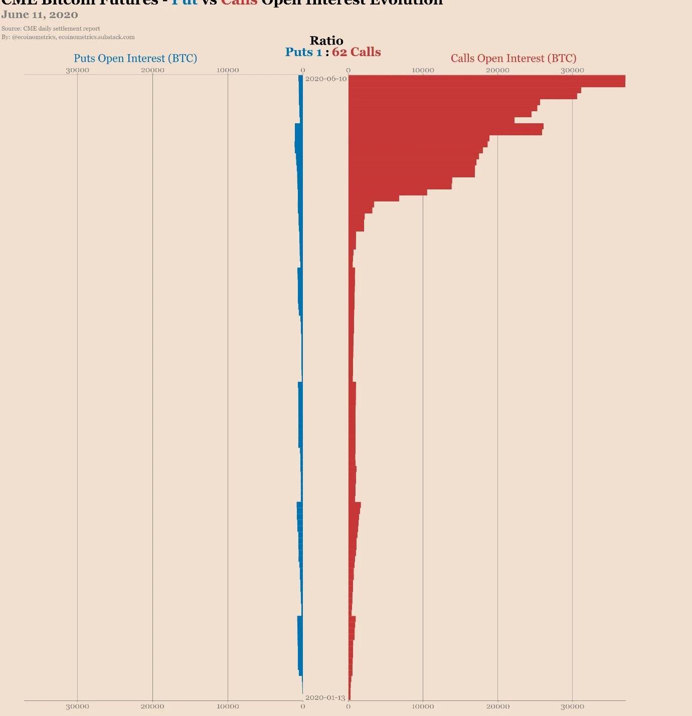 資料來源:Skew下面的CME看跌與看漲未平倉權益演變圖更全面地展示了大趨勢。它顯示出今年年初以來,看漲期權顯著增長,并且越來越偏向于看漲一方。根據6月11日CME披露的數據,Ecoinometrics報告的看跌與看漲比率為1:62。但此后,市場在6月11日晚間突然出現了800美元的價格下跌,期權市場對此反應迅速。我們根據CME最新披露的信息重新評估了該數字。截至6月11日收盤,未平倉的看跌/看漲比率已反彈至1:45,但仍處于不可思議的低位區間。
