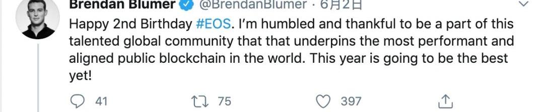 XRP/HKD-2.66%"EOS2周年快樂!"“我很榮幸能成為這個才華橫溢的全球社區的一員,這個社區為世界上性能最強的公共區塊鏈奠定了基礎,今年將是最好的一年!”6月2日,EOS“母公司”,Block.one的首席執行官BrendanBlumer在推特上表達了對EOS誕生2周年的祝福,可惜,反響平平。