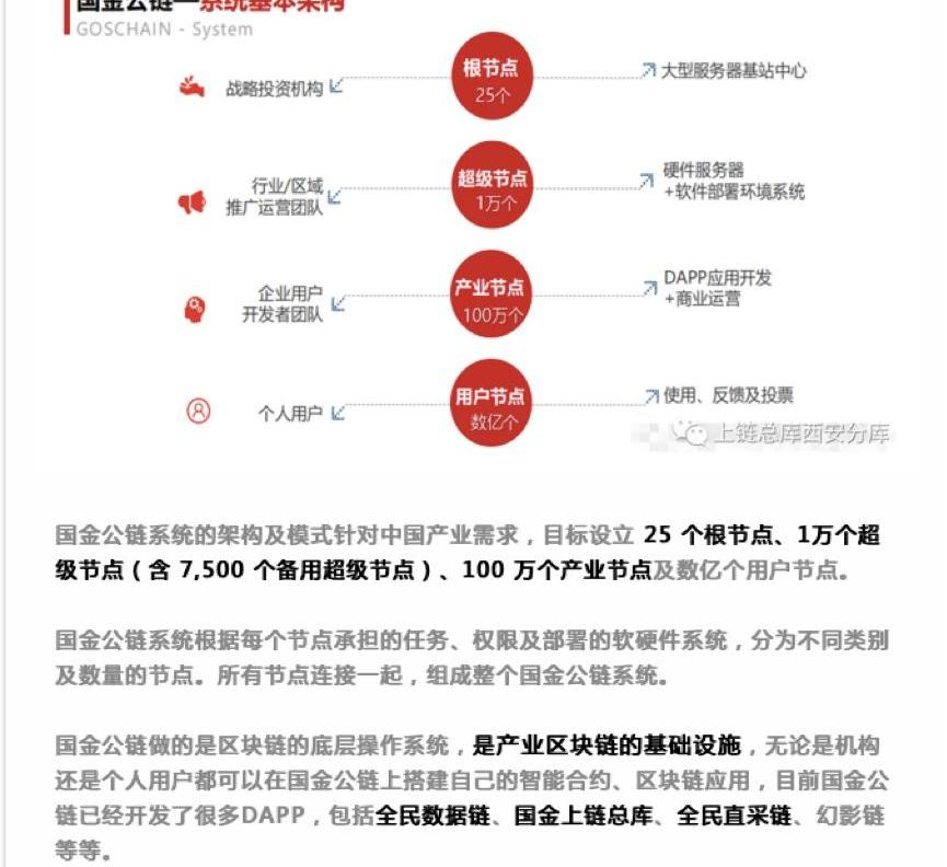 XRP/HKD-3.54%編者按:本文來自蜂巢財經News,作者:JXkin,Odaily星球日報經授權轉載。“國金公鏈是國家戰略平臺,是生態,有多個側鏈組成。”添加劉磊為微信好友后,還沒來得及說明來意,他就主動介紹起項目。劉磊自稱,他只是一個國金公鏈的共建者,目前在杭州。這個號稱“中國第一公鏈”的項目,早在2018年下半年就在微信群中推廣,去年,“國金公鏈已經拿到國家合規牌照在運營”的說法流傳在推廣群中。推廣什么?簡而言之:節點,名曰“通證積分”的GOS,以及各種國金公鏈側鏈項目的“通證積分”。盡管叫公鏈,但國金公鏈明確表示,不開源,白皮書里也沒有公示共識算法。盡管有節點,但節點不需要布置服務器,想當節點,花錢買下名額,在各地開分公司即可。買了節點,便有了GOS。國金公鏈的一系列運作方式都突破了區塊鏈的普世概念,但這并不妨礙它面向投資者,持有GOS及其側鏈通證積分的人自稱“共建者”。GOS會進入二級市場交易,但不會上幣圈交易所,因為不合規,要等國家隊。這是投資者、推廣者堅信的說法,也是他們在場外點對點買入“積分”的原因。的確,國金公鏈在首批“境內區塊鏈信息服務備案清單”中,但負責登記備案的國家互聯網信息辦公室多次表示,“備案僅是對主體區塊鏈信息服務相關情況的登記,不代表對其機構、產品和服務的認可,任何機構和個人不得用于任何商業目的。”顯然,國金公鏈并非沒有商業目的。不久前,投資者群里流傳著“國金公鏈已經成為國資委下屬央企”。而國資委的企業名單里,并沒有它的身影。看不見區塊鏈的國金公鏈