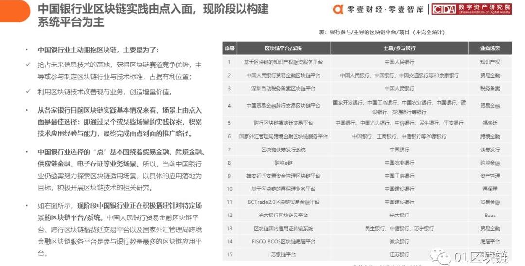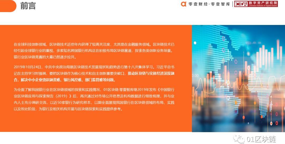 XRP/HKD+0.71%編者按:本文來自01區塊鏈,作者:照生、雨林、趙越、王夢婷,Odaily星球日報經授權轉載。提高效率與降低成本是各行各業在市場競爭中不變的兩大追求。然而在信息差客觀存在以及市場主體地位不同的背景下所進行的市場博弈,往往會令成本居高不下且嚴重降低協作效率。在全球科技創新日新月異的背景下,應用新技術實現降本增效成為眾多行業不約而同的選擇。而在眾多新技術中,區塊鏈以共識算法建立信任并保證鏈上信息難以被篡改且可追溯的特性,為市場協作提供了良好的保障。盡管區塊鏈最初專為比特幣而創建,但今天區塊鏈技術的應用潛力遠遠超出了加密貨幣的范疇。尤其是在金融服務領域,區塊鏈技術已經引起全球銀行業的重視,知名的跨國銀行機構正積極布局區塊鏈賽道,探索各類創新業務場景。銀行業區塊鏈競賽的大幕正逐步拉開!中國銀行業在區塊鏈領域活躍而豐富的探索與實踐已經成為世界銀行業改革的一個縮影。為更直觀呈現中國銀行業在區塊鏈領域的應用實踐歷程和所處階段,01區塊鏈通過對市場公開信息及機構數據進行細致梳理,并與業內人士充分調研交流,以近50家銀行、數百條銀行區塊鏈實踐數據為樣本,編寫了國內首份系統性銀行區塊鏈應用報告——《中國銀行業區塊鏈應用與探索報告》,以期全面展現我國銀行在區塊鏈領域的布局、實踐以及所處階段,為銀行及相關機構開展與區塊鏈探索和實踐提供參考。5月20日,零壹財經·零壹智庫聯合數字資產研究院舉辦報告線上發布會,區塊鏈分析師蔣照生和林澤玲在會上發布了報告,同時邀請了趣鏈科技北京分公司副總經理張貝龍,對趣鏈科技服務銀行業的實踐經驗與案例進行了在線分享。以下為報告全文: