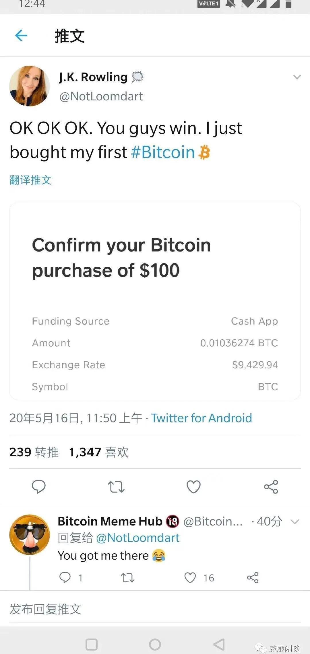 “這一開始只是一個玩笑,但現在我恐怕再也不能登錄Twitter而不讓別人因為我沒有比特幣而生氣了。如果有一天你會在街上看到一個遲暮的老婦人,她正試圖用一本《哈利波特》的書換一個土豆。請對她好一些,因為她正努力去理解。”大家也可以看到,這么些Twitter都是在試著幫她理解比特幣,JK羅琳接受著比特幣愛好者們的各種解釋,并轉發她認為不錯的進行回應和討論。2我尋根溯源了一下,發現開端是Coindesk的記者和編輯發了條推說“我這周看到的最樂觀的信號是一位主流小說家(我不愿說出她的名字,但她太棒了,不是科幻小說那種類型的人)讓我(主動地!)詢問有關比特幣的問題。”然后JK羅琳在下面回復:我不懂比特幣,可以跟我介紹一下嗎?