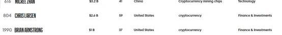 作者|哈希派-LucyCheng四月初,《福布斯》雜志發布了2020年度全球億萬富翁榜,共計2095位富豪上榜;其中加密貨幣及區塊鏈領域入圍的有四人,分別是,比特大陸聯合創始人詹克團和吳忌寒、Ripple聯合創始人ChrisLarsen以及Coinbase首席執行官BrianArmstrong。