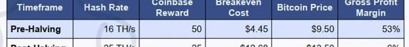 從上表中可以看出,比特幣第二次區塊獎勵減半之后,網絡算力上升到1,580,000TH/s,區塊獎勵從25BTC減少至12.5BTC,收支平衡成本從217美元上漲到453美元,雖然比特幣價格從420美元上漲到680美元,但礦工的毛利潤率卻從48%下跌至33%。第三次減半:2020年