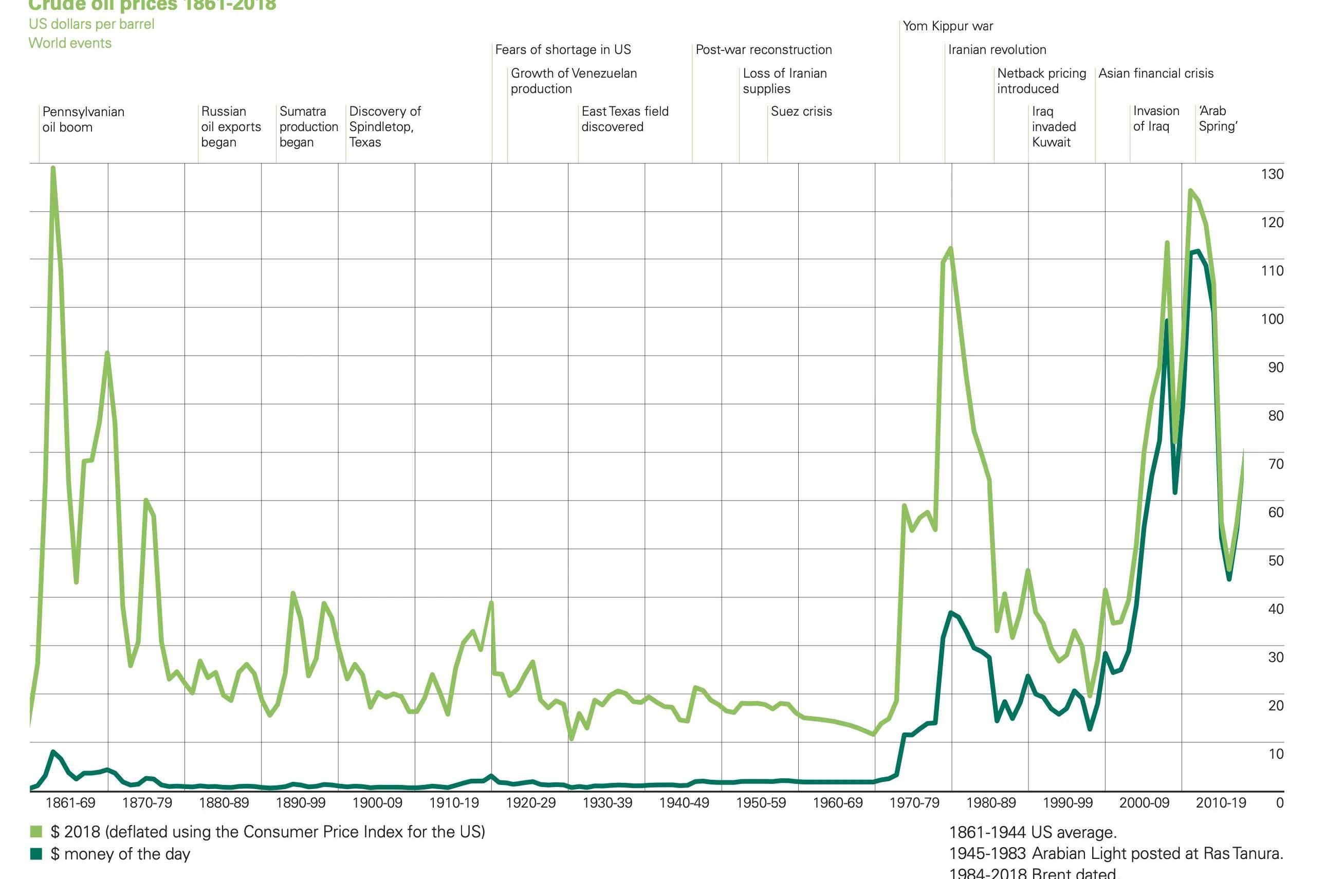 Curdeoilprice1861-2018歷史上的油價變化主要分為以下幾個階段:1861年-1969年間:在1861年開始,折合成現在的物價,油價非常高。這是因為石油在當時不是必需品,雖然石油逐漸的普及,油價也逐漸降到了20美元左右。這個價格持續了將近100年。二十世紀70年代,發生了第一次能源危機,OPEC為了打擊以色列,對石油出口進行限制,石油的供應減少,進一步推高了石油的價格。二十世紀80年代前后發生的第二次能源危機,則進一步推高了油價。當時的伊朗革命,造成第二次石油危機原油價格從1979年的每桶15美元左右最高漲到1981年2月的39美元。此后,經歷了1998年亞洲金融風暴,2001美國“911事件”,油價也因需求的下降而下降。但隨著各國經濟復蘇,油價又迅速上漲。尤其是2004年開始,以中國,印度及俄羅斯等國家的經濟全面復蘇,生產導致對石油的需求也繼續提升。油價也開始迅速飛漲。一直持續到2008年全球金融危機,油價極速下跌,但同樣的,隨著經濟的迅速復蘇,油價也迅速反彈。