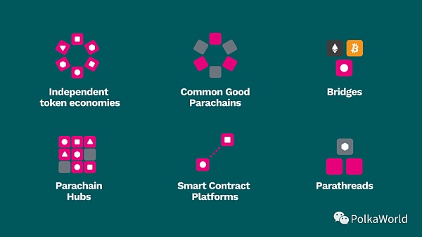 由于 Polkadot 給了平行鏈團隊最大程度的自由,去將其網絡設計成最符合他們愿景的方式,平行鏈可以并且確實采用了多種不同形態,包括: