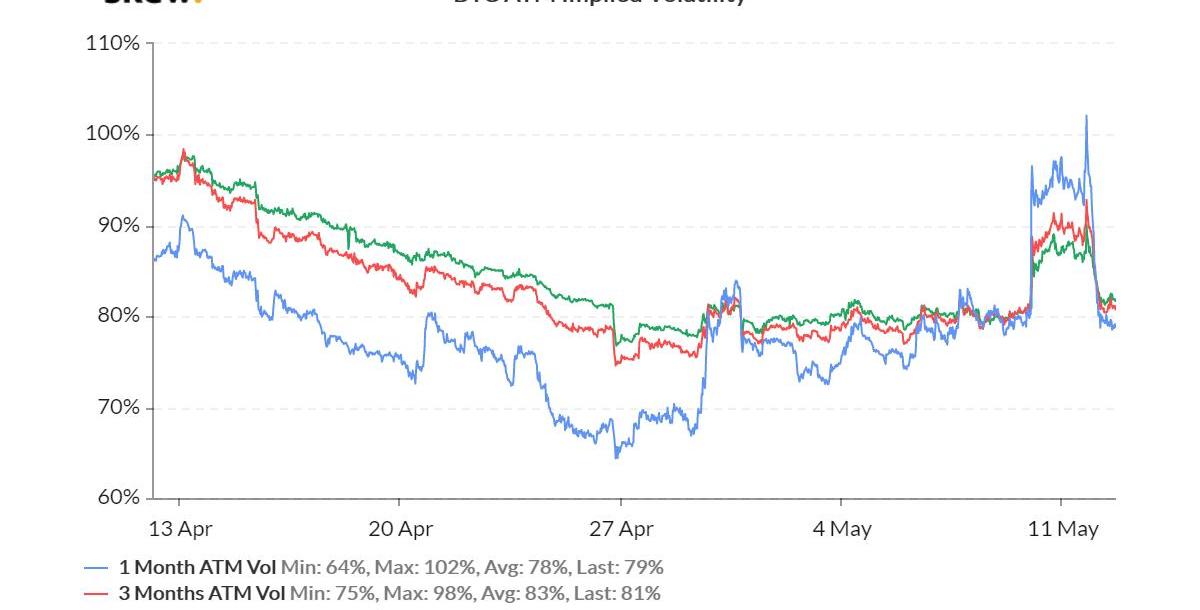 在過去的幾個月中,分析人士在流傳這種說法,即在減半之后,BTC算力可能會大幅下降。據推測,這可能是由礦工關閉了ASIC礦機所致,關機原因是BTC區塊獎勵從之前的12.5枚BTC削減至6.25枚BTC。迄今為止,人們仍有理由擔心會發生“死亡螺旋”,這將迫使大型礦工出售礦機,甚至可能使那些杠桿率過高的礦工破產。造成這種局面的一個可能原因是,對礦工至關重要的收入已被削減。請記住,交易費很少會超過礦工收入的5%,而礦工收入主要組成部分是BTC區塊獎勵。將挖礦業50億美元的收入削減一半可能會產生各種意想不到的結果,包括硬分叉。交易員依賴隱含波動率,而減半影響了這一指標