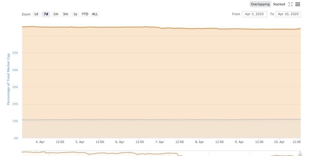 數據來源:標準共識、CoinMarketCap根據標準共識情緒指數反映,目前市場情緒狂熱,最新指數為2.33,在市場進入狂熱情緒的情況下,成交額方面卻沒有大的增長。近期受外部影響較大,石油、美國失業率以及美國再次放出2.3萬億美元的貸款額度都影響市場情緒波動。但BCH和BSV的減半并沒有如預期促進價格上漲,市場反應較為平淡,看跌情緒漸起。同時根據比特幣占總市值比例圖,比特幣市值占比產生一定下降,圍繞著65%的占比上下浮動;其他幣種市值占比也無明顯變化。BTC仍處于市場的統治地位,市場主流幣的漲幅較高于BTC,BTC并未產生強烈的上漲沖動。