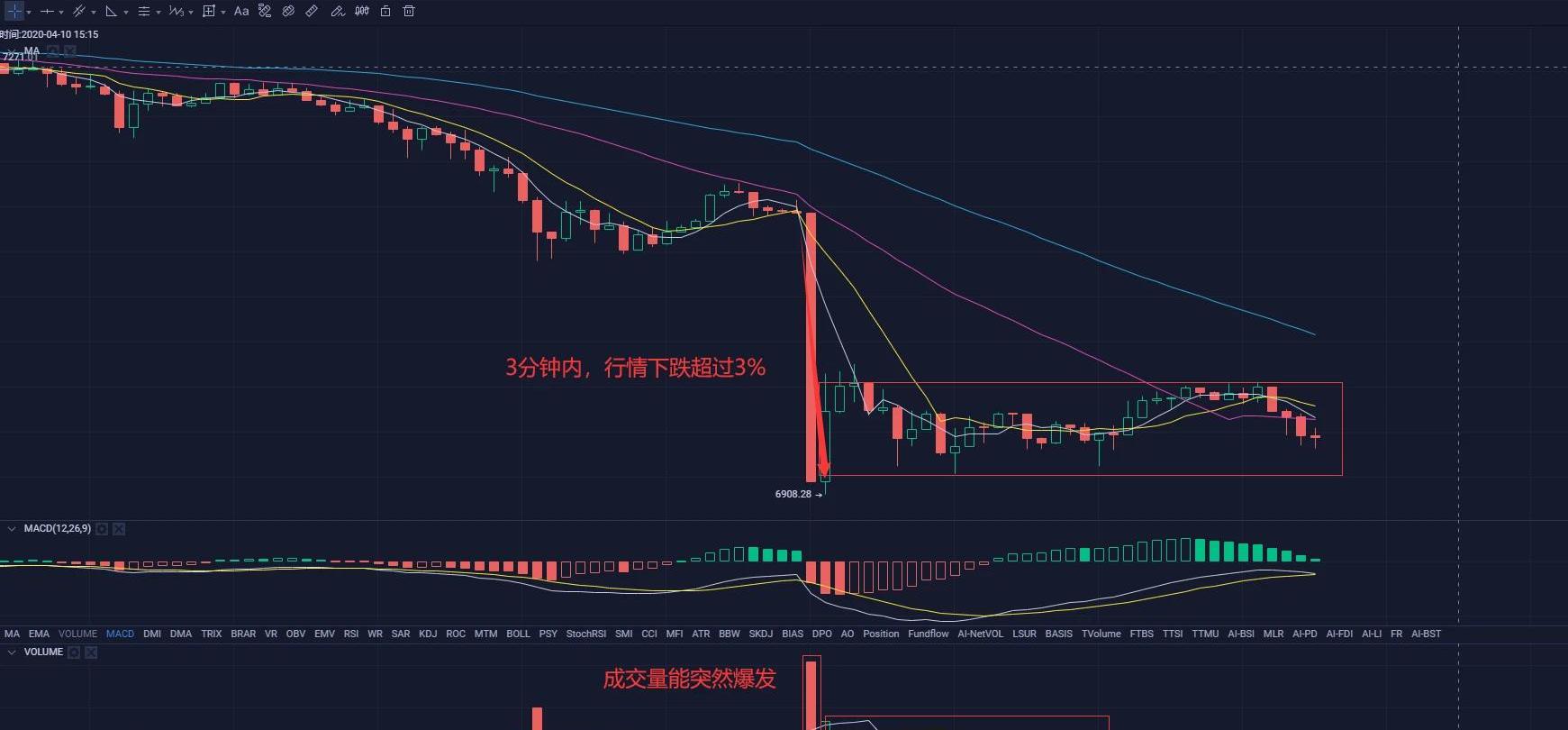 這是下午一點鐘時行情突然跳水的盤面,3分鐘內行情快速下挫,跌幅超過3%,這就是莊家控盤使然。原因有二,一是行情下跌后快速進入橫盤模式,短時間內價格收放自如。二是在行情快速下挫時量能迅速放大,隨后又快速消失,如果是散戶導致或者自發性行情,無法在短時間內做到如此默契。行情尚未結束,當前行情的關鍵并不是多空,而是莊家的隨意控盤。當市場多單大于空單時莊家可能通過急跌爆掉大部分的多單,而當市場空單大于多單時空頭可能又會遭殃,在多空比相當時,多空雙爆的概率又會變大,莊家的動向變得捉摸不透。