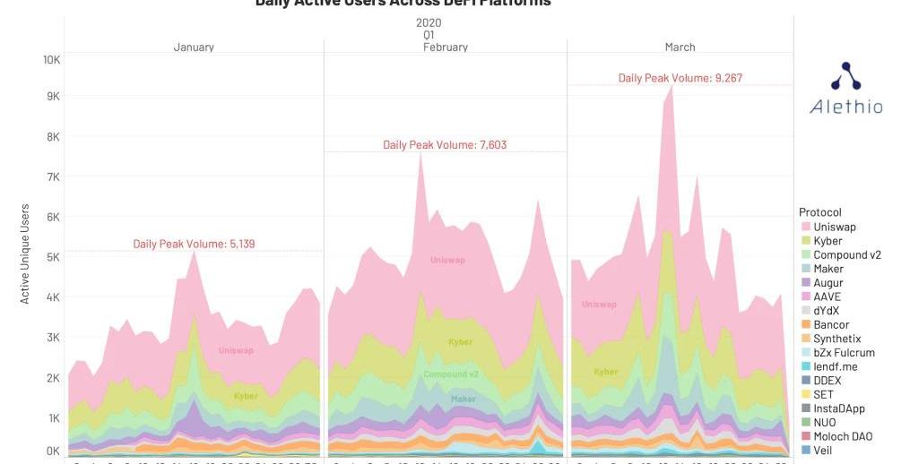 事件描述:在3月12日,密碼學貨幣市場暴跌近40%——同時,全球股票市場也出現崩盤。在3月12日和13日,以太坊上的活動激增,許多去中心化交易所都處于有史以來最活躍的時期。重要性:許多跟區塊鏈有關的宣傳都把區塊鏈資產稱作“避險資產”,可以避免傳統金融領域中大型銀行、公司和政府的管理不當問題。許多業內人士認為,理想狀態下的密碼學貨幣與股市不存在相關性,而是作為一種更加安全的資產集合供人們儲值和投資。黑色星期四揭露了一個非常殘酷的事實:至少就目前來看,密碼學貨幣領域的人必須承認密碼學貨幣市場與傳統市場存在相關性,并采取應對措施。注:2020年第一季度DeFi報告中的所有數據均由AlethioAnalytics收集并分析。欲知更多信息,請訪問aleth.io。2020年的去中心化金融