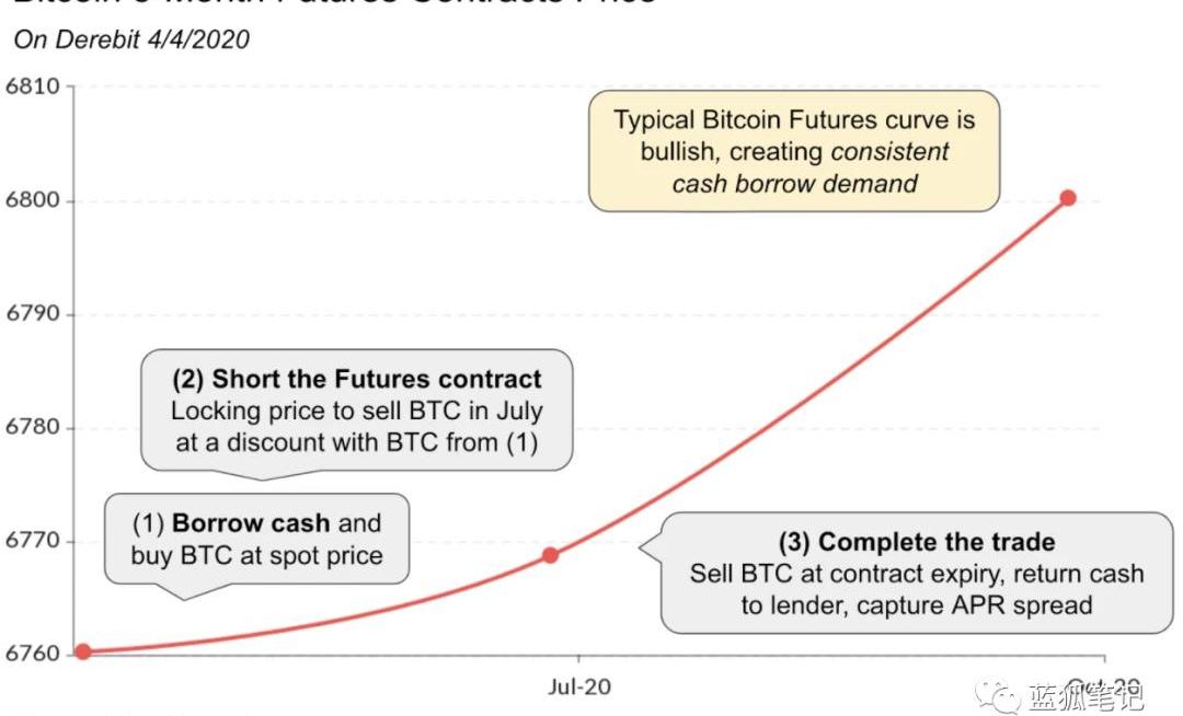 借款人抵押某種形式的抵押品,并借入加密貨幣或現金,其原因是:1.投機投機包括做多或做空。做空是借入加密資產并將其售賣換取現金。做多是借入現金并買入加密資產。做空和做多都是投資者增加回報或對沖風險的重要機制。2.運營資本支持業務發展或個人事務的流動性資金。比特幣對于幾個業務來說是重要的運營資本,其中包括礦工、OTC柜臺、匯款、貿易公司等,它們需要獲得大量的資本以推動運營。此外,通常來說,借貸不用納稅,這樣在無須發生稅務罰金情況下,保持加密貨幣的敞口。3.衍生品套利衍生品套利要求更深入的理解。以比特幣期貨合約為例子。這些合約就未來的某個時間點以某個特定價格達成買入或賣出比特幣的協議。這些市場的定價方式反映了投資者的情緒。通常來說,BTC期貨市場是看漲的,其中在未來三個月買入或賣出比特幣的價格要高于今天的現貨價格。現貨價格和期貨價格之間的價差代表了通過套現交易進行的套利機會。如果3個月的BTC期貨價格比今天的現貨價格高于5%,那么,精明的投資者可以借入現金并購買今天的BTC,與此同時,做空期貨市場,這可以在接下來的3個月中有效捕獲20%的年化收益。如果3個月內借入現金所收取的利率不到20%的年利率,那么用戶是可以獲得利差的。