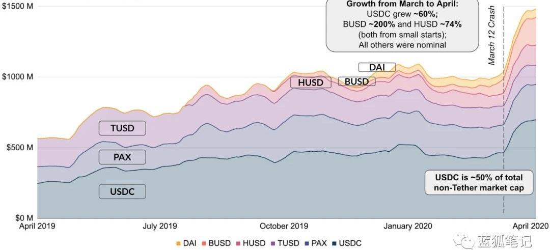 在深入探討之前,簡要回顧一下穩定幣在今天加密領域的用法:1.用于交易和投機的合成美元很多交易所沒有得到監管機構批準,無法提供真正的法幣服務。但是,大量的交易和投機活動發生在法幣和加密貨幣之間,穩定幣為交易所長尾提供合成法幣訂單簿。2.結算穩定幣既有加密貨幣的優勢,又沒有加密貨幣的不足,且被越來越多地用作為商品和服務的結算。有趣的是,亞洲似乎自然地在一些加密相鄰領域采用穩定幣,Coinbasecommerce看到穩定幣采用的強勁和新生的增長。3.資本流通穩定幣是全球的開放生態系統,使其成為資本流通和USD敞口的有吸引力選擇。如今面對COVID-19的不確定性,美國發行2萬億美元的一攬子刺激計劃,并將銀行存款準備金降至零,且將聯邦利率降至創記錄的低水平。同時,金融市場處于擔憂情緒,投資者大量出售資產以管理其杠桿頭寸、對沖風險,并尋求穩定性。穩定幣市場發生了什么?