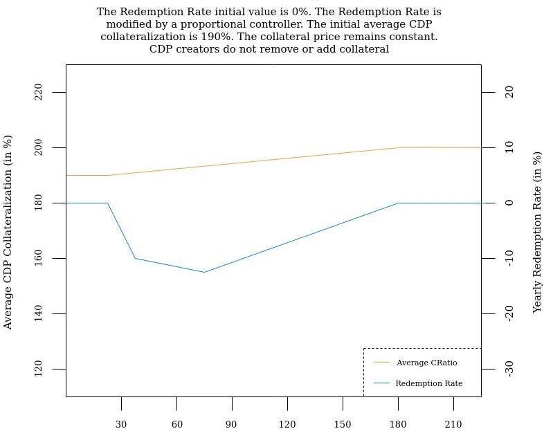 圖1B在第30天之前,反射債券的贖回價與市場價均為1美元。因為兩個價格之間的偏差為零,贖回率為0%。此外,整個系統的平均抵押率為190%,為簡單起見,我們假設抵押價格始終為100美元,而清算比率始終為150%。在30到40天之間,由于人們開始為反射債券支付了更多,其市場價格上漲到1.1美元。為了降低市場價格,這個系統需要創造更多的債券。為鼓勵債券發行,贖回率為每年-10%,同時市場價格飆升10%;在第40到75天之間,市場價格保持不變,但贖回價格緩慢下降,因為它受到贖回率的影響。由于市場價和贖回價之間的偏差增加,贖回率也繼續下降。同時,所有CDP的借款能力都將上升,因為反射債券正在重新定價;隨著CDP持有人意識到他們的借款能力在增長,即使他們的抵押品價格保持不變,他們也會被激勵去產生更多的債券。這就是為什么在第75天,隨著越來越多的債券進入市場,我們開始看到市場價格緩慢下跌。同時,隨著市場價與贖回價格的差距縮小,贖回率開始向0%逼近;在第180天,兩種價格之間的差距變為0,贖回率現在變為0%,所有CDP的借款能力停止增長;如果市場價格低于贖回價格,也會出現類似的情況。贖回率將變為正,因此贖回價格將開始上升。由于贖回價格上漲,反射債券會重新定價,因此創建反射債券的成本會變得更高,然后當前所有開倉CDP的抵押比率都下降了。這意味著CDP創建者將意識到,他們要么需要在頭寸中增加更多抵押品,要么償還部分債務,以避免清算。