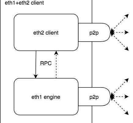 其中eth2引擎和eth1引擎一起運行,通過eth2客戶端驅動的RPC進行本地通信。兩者都會維護自己的p2p接口,連接到對等方并處理與每個特定域相關的網絡協議。以太坊2.0客戶端