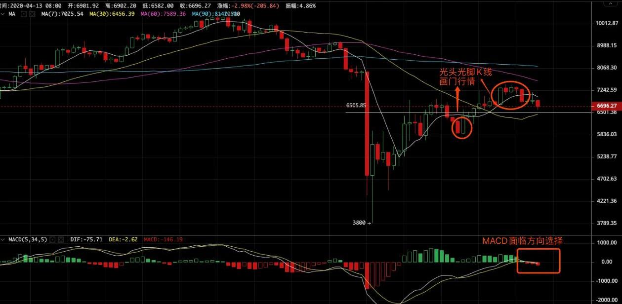 但行情的詭異處便在這里,莊家故意推高價格,突破了7000美金后繼續推高到7179美金,高于前期高位整理的低點,但隨后就是砸盤操作,盤面再次跌破7000美金,震蕩區間低點也由之前的6750美金來到了6600美金。昨天的文章準確的分析了莊家可能的動作,并給出了最可能的結果:先拉升后砸盤,其實也是一種基于盤面的博弈。我們知道,當下的環境,已經不是加密貨幣市場自身了,而是受制于外部大經濟環境的制約。大環境的因素我們的文章一直在提,但這個影響又不可能在短時間內消除,因此始終是個不安定的因素,特別是在美國的疫情爆發愈演愈烈的時候。美國勞工部數據顯示,4月3日當周美國初請失業金人數為660.8萬,過去三周,美國累計初請失業金人數超過1600萬,這意味著美國在三周時間內喪失了10%的勞動力。失業潮沖擊的,不止是消費者對健康問題的擔憂,更重的是因現金流壓力導致的信心問題,和對未來個人生活消費和社會經濟環境等諸多問題不確定性的擔憂和焦慮。在這樣的影響下,傳統金融市場遭遇的是多空博弈:疫情對經濟的利空沖擊,和政府潛在的刺激經濟政策的利好。一方面遭遇危機,另一方面又看到希望,雙重夾擊之下,波動性便成了近期市場的主旋律。對于加密貨幣市場來說,因外部經濟環境危機導致部分資金進入幣市,我們不能說沒有,但也不能抱太大希望。危機之下,市場情緒會傳染,沒理由因為恐慌而停掉中低風險的傳統金融市場標的投資,反而加大高波動高風險的加密貨幣市場投資,這在邏輯上是說不通的。一般來說,投機市場價格波動背后的驅動力是投資者對未來價格的預期。要提升投資者的預期,需要講故事,畫餅來描繪未來的可觀收益和前景。只有在投資者認為價格會上漲的時候才會瘋狂買入,而在買入的過程中產生的樂觀情緒足以推動更多的參與者進場。2020年的減半行情,就是這么來的。但現在,外部大環境不穩,幣市又缺乏新的故事可炒,受兩者的制約,我們可能不得不面臨一個困境和現實:加密貨幣市場很難短時間內好轉起來,波動性成為當下最大的特點。圍繞著波動性,需要新的投資策略與之對應,最主要的便是分析層面。消息面和政策面的因素,除非是重磅消息和政策,否則對當下市場行情的影響微乎其微。現在的關注重點,在外部的經濟環境、K線技術指標、市場情緒、莊家和散戶的心理博弈層面,需要我們多復盤,多思考大盤可能的走勢,整體上保持謹慎而不是盲目樂觀的態度。具體到操作層面,切忌在趨勢沒有走出來前盲目壓方向,偏執的認為一定會上漲或是一定會跌;低吸高拋可行,但需要設置止盈止損,買入交易成交后馬上下一個止損單來做風控,各大交易所平臺均有止盈止損、計劃委托之類的功能;倉位要控制好,當下的行情,倉位不宜超過1/2,保持半倉或是2-3成倉位最好;定投的話,只建議主流幣BTC、ETH和主流交易所的平臺幣,只有這兩類幣種,才是最不容易死掉、最具投資價值、有潛力和發展前景的幣種。回到行情上,BTC今天凌晨反彈至7179美金后沖高回落,延續下跌走勢,到目前都沒有走出來。整體形勢依舊偏空,震蕩區間擴大至6500-7000美金區間,6500美金是前期的反彈支撐和底部區域,短期跌破的概率不大。留意日內能否沖擊6750美金,若晚間美股上行,則有較大概率反彈,7000仍是強壓區間;如果日內無法站穩6750美金,則較大概率在6500-6750美金區間內震蕩整理。