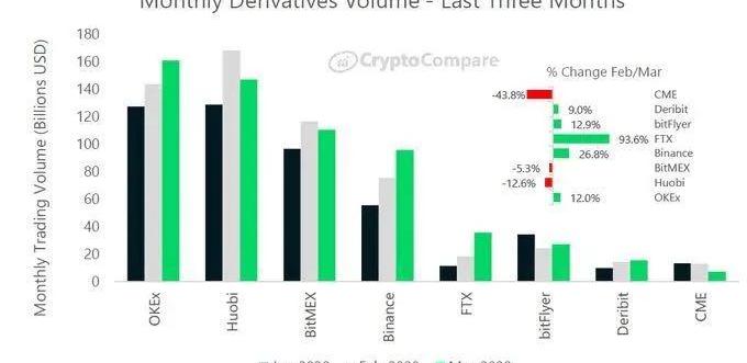來源:skew根據區塊律動的報告,OKEx交易平臺三月份的衍生品月交易量為1610億美元,位列首位;其次是Huobi和BitMEX,月交易量分別為1470億美元和1100億美元。幣安和FTX的衍生品交易量排名第四及第五,其中幣安交易量增長27%,月交易量為958億美元,FTX交易量增長94%,月交易額為358億美元。