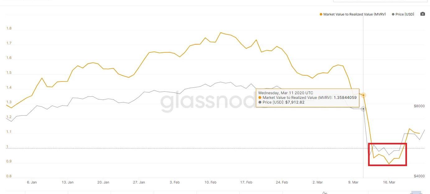 比特幣市值/UTXO成本MVRV可用于衡量市場在某個具體的時間點,對比特幣的價值是處于高估狀態還是處于低估狀態。從歷史數據來看,比特幣的MVRV峰值和價格峰值往往同時發生。2017年12月,MVRV數值飆升到接近4.5的水平,2019年6月,MVRV數值在當時達到一個小高峰,在這兩個時期,比特幣價格都處于時間段內的高位。因此,MVRV是一個比較好的用于判斷市場處于頂部還是底部的指標。MVRV峰值通常表示市場處于頂部,而MVRV低谷則表示市場處于底部或者積累期。glassnode數據顯示,最近一次MVRV數值降到1以下是在3月13日至3月18日,當時幣價處于5500以下區間。事后看來,這一時期是比較好的囤積比特幣的時期。而目前,比特幣MVRV數值相對于3月13日至18日期間已經有所回升。