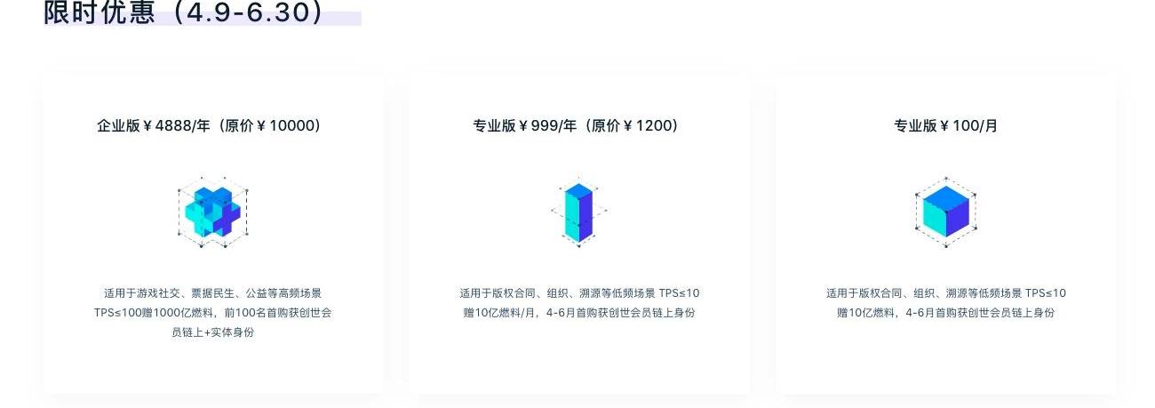 從官網可見,開放聯盟鏈為用戶提供了專業版和企業版兩種版本,產品有三種定價,分別為100元/月、999元/年、4888元/年。企業版適用于游戲社交、票據民生、公益等高頻場景,專業版適用于版權合同、組織、溯源等低頻場景。
