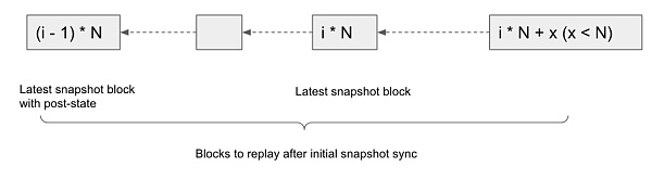 為了啟用快速同步,我們有一個周期性的快照區塊(快照間隔 = epoch = 例如,14 周)。一個快照區塊包含前狀態哈希這一附加信息,即前一個快照區塊的后狀態哈希(執行交易之后的狀態哈希):