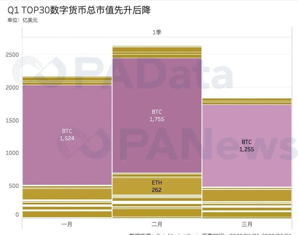 分析師|Carol編輯|畢彤彤出品|PANews2020年開年,受新冠疫情的持續影響,全球金融市場遭遇“黑天鵝”,數字貨幣市場也受到重創。根據CoinMarketCap的數據,3月市值排名TOP30的數字貨幣總市值環比下跌30%,BTC跌幅超10%居跌幅榜第六,幣價平均日間振幅超過8%。不僅如此,二級市場的變動還觸發了一系列連鎖反應,比如多種礦機已到關機價使礦業生存發展受挑戰,DeFi平臺觸發清算程序傳出關停危機。危機相倚,在劇烈波動的市場中,有哪些新變化值得關注?對此,PAData進行了今年第一次加密貨幣TOP30觀察,觀察期為1月1日至3月31日。此前,PAData在去年進行了四次觀察,先后觀察到了平臺幣在交易所“打新”運動中強勢崛起,MKR在Defi概念未火之前已經異軍突起于熊市,BTC在牛市中擁有除穩定幣以外的最低波動性,公鏈幣搭乘政策東風集體狂歡等變化。PADataInsights:1、Q1TOP30的數字貨幣總市值先升后降,3月環比下跌了29.84%,創下自6月以來月環比最大跌幅。2、比特幣的市值占比有所下降,從1月的70.10%降至3月的67.91%,創下自去年6月以來的最低占比。3、Q1市場格局仍舊維持了公鏈代幣和支付結算幣為主的形態,但平臺幣和穩定幣實現了進一步擴張。目前市值TOP30中的平臺幣包括排名第9的BNB、排名第11的LEO、排名第17的HT、排名第29的OKB,還有排名32的FTT。4、Q1數字貨幣市場的兩個板塊概念是“減半”和“平臺幣”,BSV、DASH和OKB、LEO漲勢良好。5、市值TOP30的數字貨幣幣價平均每日波動率約為8.66%,高于去年6月以來的平均水平,與去年5月的平均波動率相當,當時正處于小牛市上升期。3種數字貨幣新晉XTZ和MKR變動最大