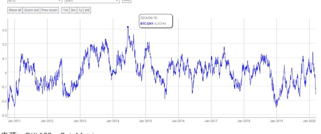 從比特幣價格波動率來看,比特幣屬于風險資產。然而,除了比特幣早期和個別時期出現0.3以上的關聯系數之外,過去十年間的大多數時期在0.1至-0.1之間。而且,兩者的相關系數,整體上有呈現擴大的正負交替。值得注意的是,兩者關聯系數的最高值出現在2018年11月期間。期間美股出現了罕見的大回撤,而比特幣也出現明顯大跌。這和目前的情景相似,關聯原因不得而知,但不禁讓人浮想翩翩。三、比特幣與美元的關聯表現