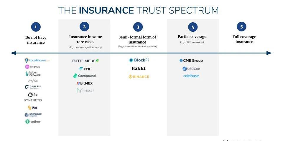 市場觀察很明顯,法律和監管監督是所有信任屬性中界限最分明的——用戶要么幾乎沒有法律保護,要么受到強有力的法律保護。法律和監管保護力度最小的協議是那些目前位于沒有任何保護性監管管轄區內的協議。如果出事了,用戶不知道應該由哪個執法機構或監管機構來處理。盡管開放金融協議還沒有經歷過法庭的檢驗,但是企業——即使它們那些位于塞舌爾等司法寬松的管轄區——也受到一些法律的約束。我們給這些交易所打2分,因為存在一些司法系統處理資金損失。而在圖譜的最右邊一列,那些提供最強有力監管保護的企業,通常位于美國、歐洲、韓國、中國和日本等發達經濟地區。保險