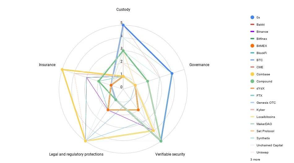 在對協議和企業進行打分前,需要建立一個評分框架。我們定義了在用戶使用某個產品或服務時必須面臨,影響總體信任的五個特性,它們分別是:托管不可變型可驗證的安全性法律和監管保護保險這些屬性的分數由兩個問題決定。問題一,“用戶會怎樣損失他們的資金?”問題二,“如果可以,用戶能如何挽回損失的資金?”。用戶損失資金的情況有以下幾種:運營商盜竊黑客盜竊運營商凍結第三方凍結程序漏洞凍結系統設計糟糕導致管理不善系統規則的改變,導致用戶容易面臨上述任一情況在某些情況下,用戶可以通過正式的保單,或利用法律追索權來挽回損失的資金。通過這五個屬性,我們定義了一個標準,將某個產品或服務從1到5打分。在接下來的五個章節,我們會介紹每個屬性,建立評分標準,并為21個產品和服務樣本打分。其中樣本來源注重多個產品種類和不同規模。托管