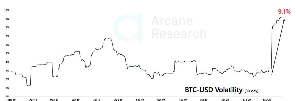 合約玩家離場的一大原因,在于比特幣當前的高波動性。從Cryptowat.ch的數據看,比特幣價格的30天波動率已經達到一年來的最高水平,目前已超過9%。波動率越高,資產收益率的不確定性就越強。ArcaneResearch指出,在全球經濟動蕩的系統性風險下,比特幣的價格走勢未來仍難平穩,故此建議市場參與者應謹慎行事。