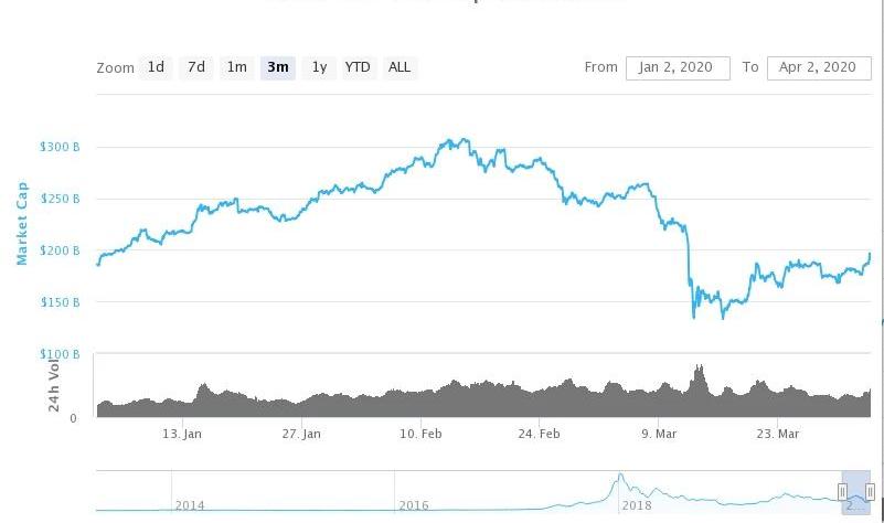 據CoinMarketCap,2020Q1加密貨幣總市值收報1779.2億美元,季度增幅為-7.07%,環比上漲5%;總市值最高突破3000億美元大關,達到3087億美元。