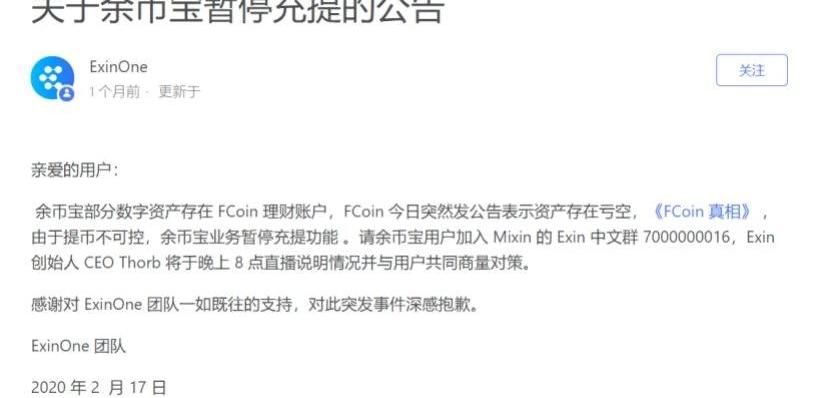 2月17日,FCoin交易所的一紙聲明,讓整個幣圈炸了鍋。FCoin創始人張健在聲明中指出,FCoin資金儲備已無法兌付用戶提現,預計無法兌付規模介于7000-13000BTC之間。在聲明的最后,張健留下了“有生之年,負責到底”八個大字。但顯然,投資者對此并不買賬,他們紛紛展開維權行動。在被FCoin波及的人中,有一群特殊的投資者,他們沒有FCoin賬戶,甚至從未聽說過這個交易所,卻最終被FCoin暴雷事件拖累,成為了FCoin受害者。他們是許多數字貨幣理財平臺的投資者。以ExinOne為例,這是一個數字貨幣金融服務平臺,經營著一個名為“余幣寶”的數字貨幣理財產品,提供USDT、BTC、ETH、EOS、BCH等幣種的理財服務,大多數幣種的年化收益率在1%-5%之間。在FCoin暴雷聲明發布當天,ExinOne也發布公告,宣布暫停余幣寶的充提業務。公告顯示,ExinOne余幣寶部分數字資產存放在FCoin理財賬戶。FCoin的突然暴雷,也引發了ExinOne余幣寶的暴雷。