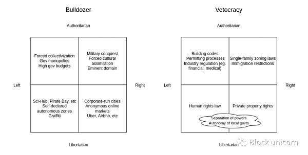 在考慮非政府組織時,否決權與推土機是一個特別有用的軸人類組織的形式,無論是營利性公司、非營利組織、區塊鏈,還是其他完全不同的東西。從這些系統中退出相對容易的能力(與政府相比)混淆了關于自由主義與威權主義的討論,到目前為止,區塊鏈甚至中心化技術平臺還沒有真正找到很多方法來在左右軸上區分自己(盡管我希望看到更多左傾加密項目的嘗試!)。另一方面,否決權與推土機軸心繼續很好地映射到非政府結構 - 可能使其與討論這些變得越來越重要的新型非政府結構非常相關。