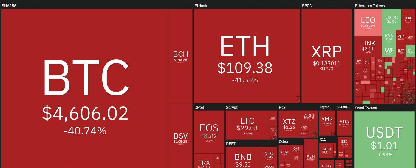 比特幣市場在剛剛經歷了從7650美元跌至5500美元的28.35%的暴跌后,11:00比特幣又突然下跌了24%,慘劇又再度上演。這使得價格下探到4679美元,創下2019年4月以來的最低價格。當天的行情走勢意味著比特幣2020年的收益被徹底抹去,目前比特幣的資產比2020年10500美元的高點下跌了58.07%,這個價格在不到一個月前還是活生生的現實。來自Coin360的數據還顯示,比特幣市值在短短一天內縮水了483億美元,從1378億美元降至895億美元,創下2013年以來的最大跌幅。