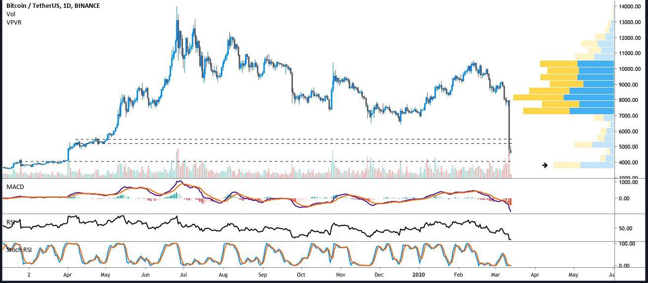 BTC美元每日圖表。資料來源:TradingView在本文發布時,價格已經反彈了9%多一點,以4800美元成交,但日線圖顯示,交易員仍然不確定市場的走向在哪里。缺乏強勁的買單和嚴重超賣的隨機相對強度指數以及移動平均收斂差的負動量在增長,都表明交易員們尚未準備在任何點位上抄底。比特幣突破5500美元和5200美元的支撐位,跌至4679美元,如果調整繼續,最后一個防御點是4030美元。低于這一水平,比特幣將重新測試3000美元區間的兩年低點。