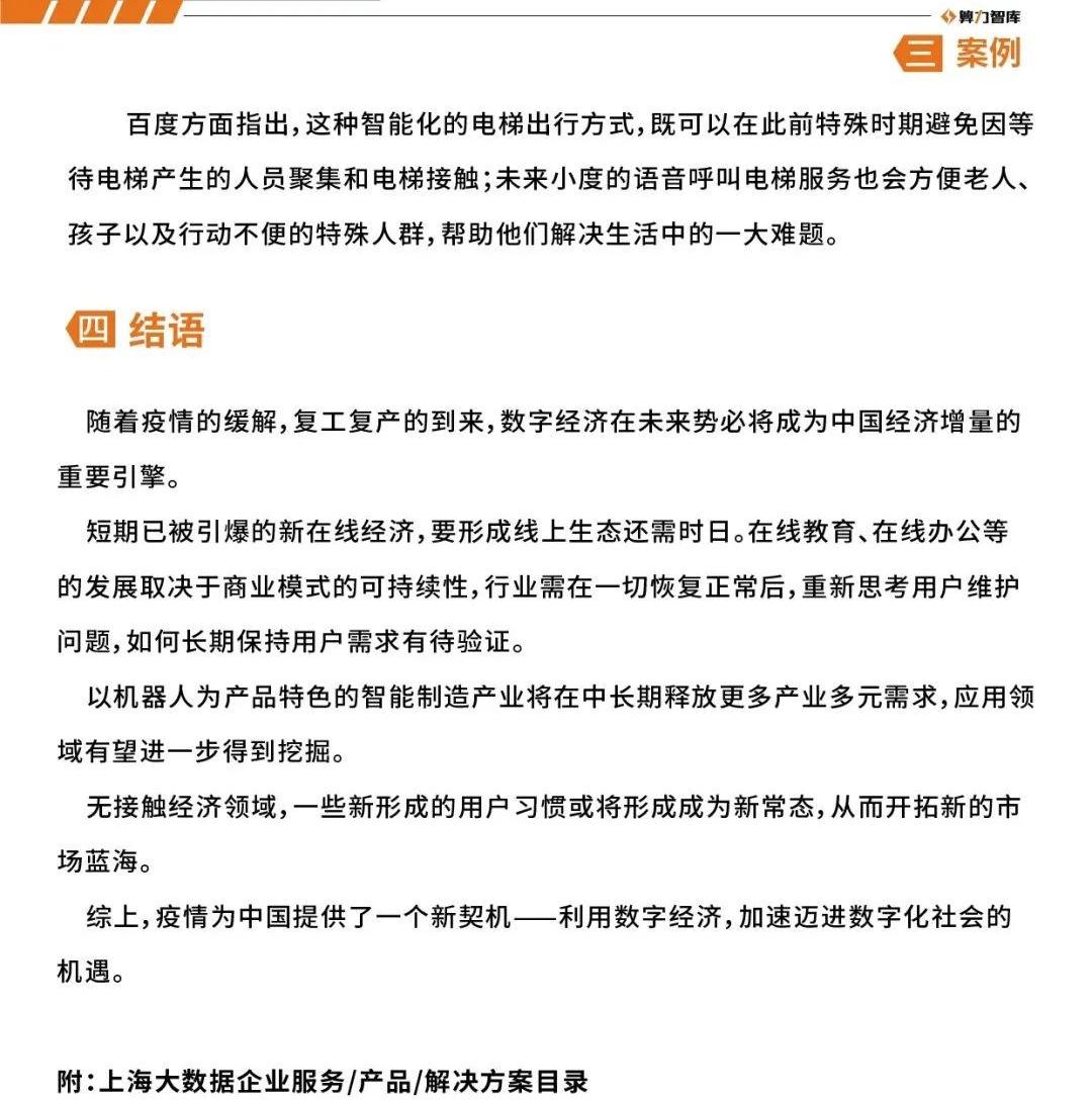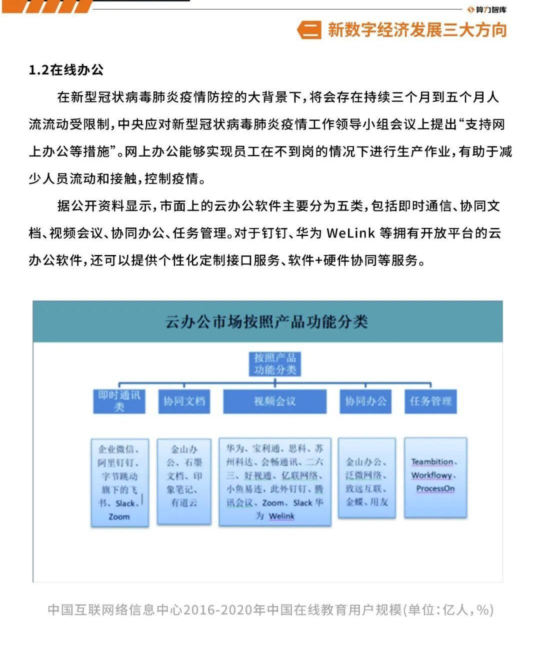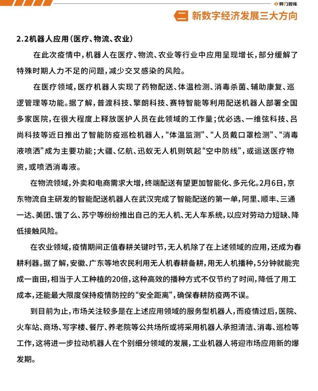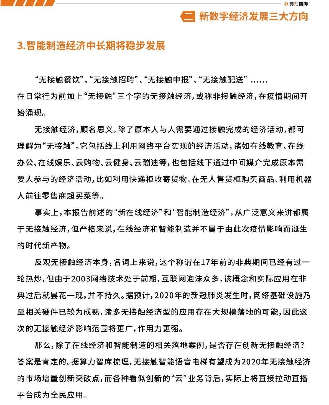 您正在閱讀算力智庫第2篇微研報系列前言受疫情影響,當傳統產業的發展一度陷入緩滯,數字經濟卻按下快進鍵。從軟件端的云上應用,到科技“硬”實力,數字經濟全面助力抗議和復工。今日,算力智庫發布《新在線經濟爆發、智能制造穩步發展、無接觸經濟興起:后疫情時代數字經濟三駕馬車》。報告復盤了疫情期間嶄露頭角而意義深遠的數字經濟代表案例,并預判邁向數字化社會的三大方向——新在線經濟、智能制造經濟、無接觸經濟。報告提出三大核心觀點:短期內,新在線經濟爆發智能制造經濟中長期將穩步發展無接觸經濟興起報告同時指出,隨著復工復產的到來,上述三大方向的發展將面臨和疫情期間不同的挑戰,并呈現不同頻的發展態勢。