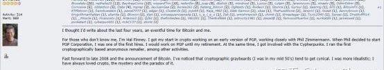 HalFinney幾乎是互聯網最早公開提到比特幣的人不過HalFinney一再否認這種猜測,2013年3月19日還在Bitcointalk論壇上寫下長篇留言,告訴大家自己與中本聰以及比特幣之間的淵源。這位2014年因漸凍癥而去世的傳奇人物在遇見比特幣之前,就與密碼學領域結下不解之緣。2002年HalFinney加入了PrettyGoodPrivacy,與PhilZimmermann共同創建起最早的PGP公司;與此同時,他還參與不少密碼朋克運動,運行了首個基于密碼學的匿名郵件系統。而到了2008年,作為一名“密碼學老人”,他在接觸到比特幣之后對這個項目產生了濃烈的興趣;甚至特地找WeiDai和NickSzabo兩位領域大牛討論了該系統的可行性。
