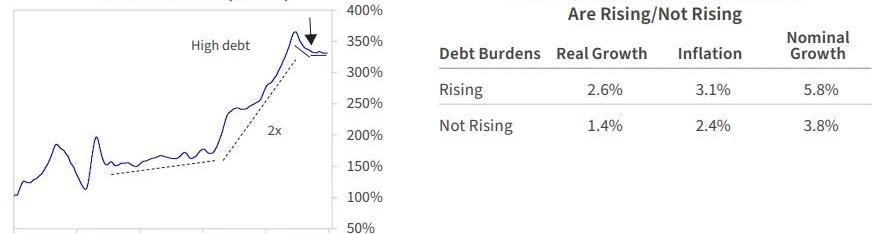 2015年底,中國將其貨幣和貨幣政策與美元脫鉤,導致新興亞洲經濟集團的規模擴大,兩種主要貨幣體系向三種貨幣體系擴張。這三種貨幣體系是全球經濟的驅動力,目前發達國家與新興國家之間大致平衡,全球經濟產出的增長現在更多地來自新興經濟體,而不是發達國家。對投資者來說,這個三極化的世界正在催生新的地緣風險。但同時它是一個巨大的機會,來進一步提升以基本面為基礎的投資多元化。因為貨幣和信貸體系是流動性、風險溢價和經濟/市場周期的最終驅動力。此外,發達經濟體和新興經濟體之間的長期狀況也不會有太多的差異,比如未來生產力的增長前景以及它們在長期債務周期中所處的位置。歸根結底,思考這些貨幣/經濟系統的風險敞口是至關重要的問題。5.新興亞洲經濟體正處于長期和短期債務周期的不同階段,生產力的提高潛力更大,這帶來了獨特且多元的投資機會。新興亞洲經濟集團的產出水平已經與美國和歐洲的產出水平之和相當。在過去三年中,它對全球經濟增長的貢獻是美國和歐洲的2.5倍。與歐洲國家之間的貿易相比,這些國家之間的貿易在其經濟中所占的比例更大。