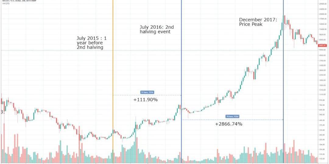 第二個減半發生在2016年7月,使BTC的每日產量從約3600BTC降至目前的約每天1800BTC。減半前BTC獲得111.9%的漲幅,減半后獲得2866.74%的漲幅,并在2017年12月份收得近2萬美元的歷史最高點。