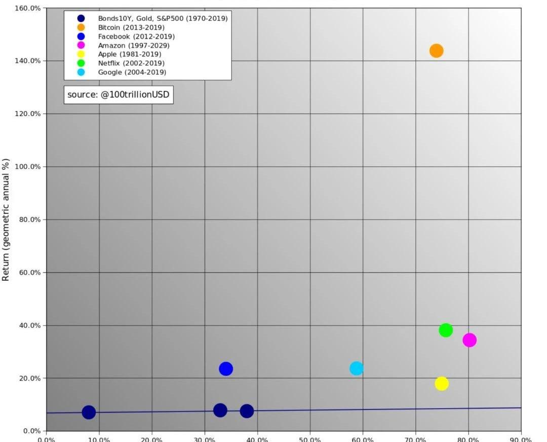 分析師PlanB(@100trillionUSD)在今年1月25日的研究顯示,BTC的收益風險比也要超越互聯網巨頭FAANG。