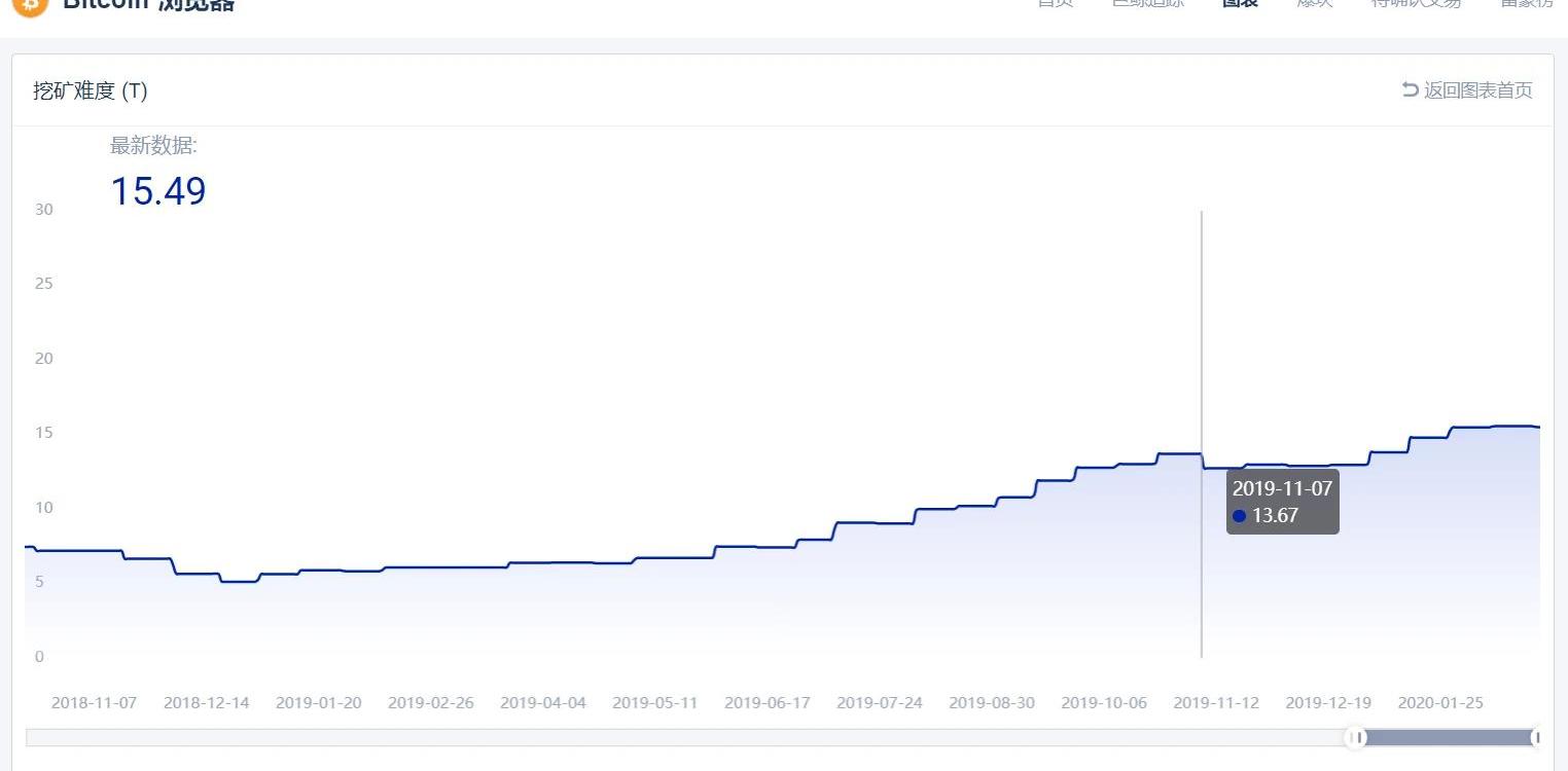 然而近一年以來,比特幣的挖礦難度似乎并未再次出現較大的波動。唯一一次較大的波動是在2019年十一月七日,挖礦難度從13.67T降至12.72T,降幅為6.95%。而十一月七日前后的比特幣也開啟了連續三周的下跌行情。