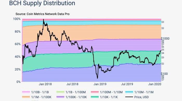 在BSV持有者中,余額至少為1/1K的地址所持供給量比例,除了在2019年2月顯著下降和在2019年6月突然增加外,其一直保持相對平穩。BSV的分發實際上比2018年8月發布其硬分叉時的比例略有減少。2018年8月,當BSV從BTC分叉出去時,這些大型地址占BSV供給量的26%。截至2020年2月,他們持有約24%的比例。