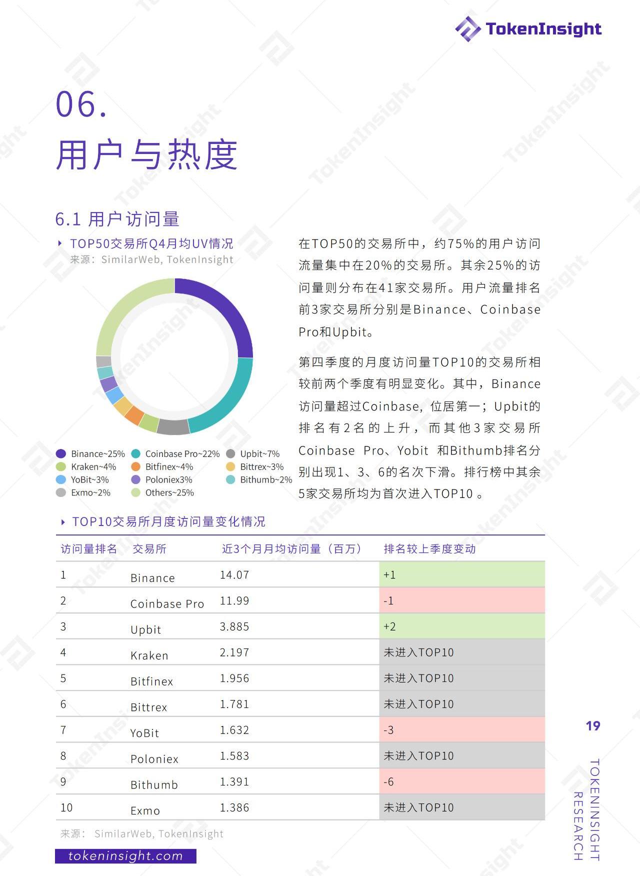 1.全年現貨交易量13.8萬億美元。2.BTC全年交易量占比48.29%。3.ETH總交易量是EOS的兩倍。4.全市場現貨交易量與BTC價格走勢相關性為0.78。5.交易量排名前40交易所總交易量占全市場的82%;全年各交易所報告交易量排名此消彼長,刷量情況仍不容小覷。6.調查的227家交易所中有18%支持USD入金。7.去中心化交易所交易量僅占全市場的0.01%,行業整體仍未成氣候。8.12個國家/地區對數字資產持積極態度。9.繼第四季度交易量下滑28%后,預測市場或將持續低迷,現貨交易所行業可能持續承壓。10.2019年第四季度,獨立訪客數排名前3家交易所分別是Binance、CoinbasePro和Upbit。美國、韓國和俄羅斯是全行業交易所月均獨立用戶最多的3個國家。11.交易所行業的布局針對美國和歐洲地區;各類法幣在細分市場交易所也均有入金通道,數字資產配置門檻在2019年大幅度降低。12.受益于交易所盈利模式較為穩定的和產品特征,平臺幣在2019年多有較為亮眼的表現,但下半年多為價值回歸。若2020年BTC等主流數字資產對無法開啟新一輪的牛市,平臺幣或將受縮量影響延續下行趨勢。