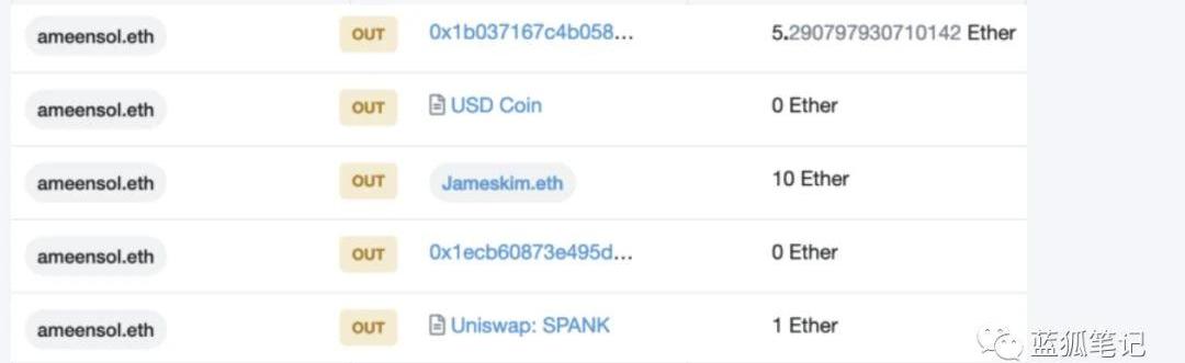 這種觀察水平也使得人們可以看到人們在用他們的錢做什么。SpankChain的CEOAmeenSoleimani擁有兩個域名“ameen.eth”和“ameensol.eth”。通過區塊鏈,你可以看到他在2019年11月30日,進行了一筆10ETH的交易,當時大約價值1,540美元。看上去這筆交易是發給GlobalBlockBranding的CEOJamesKim的,他的工作就是銷售域名,其號稱擁有20,000個加密域名。他可能要么在購買以太坊域名或一些與加密相關的域名。